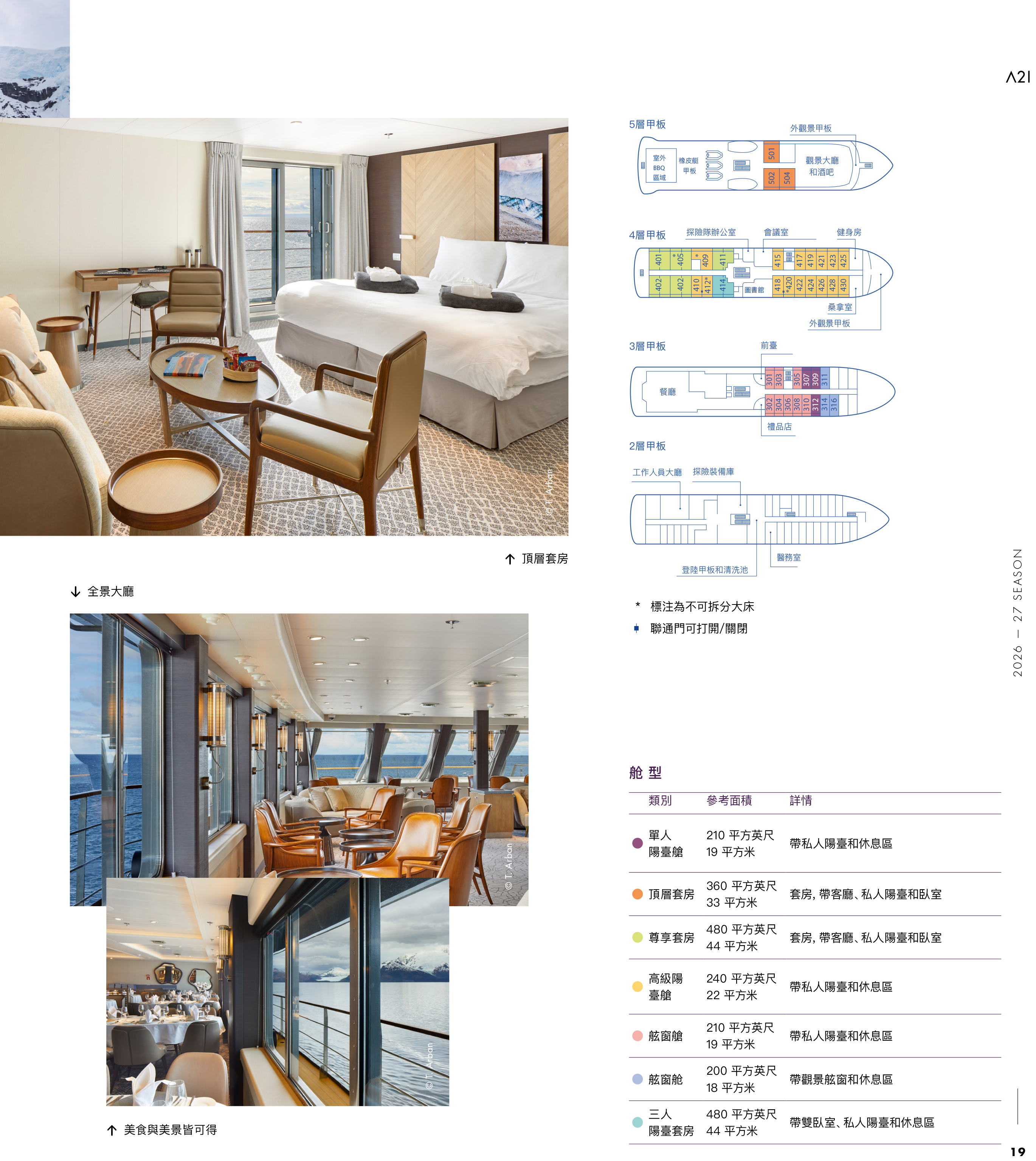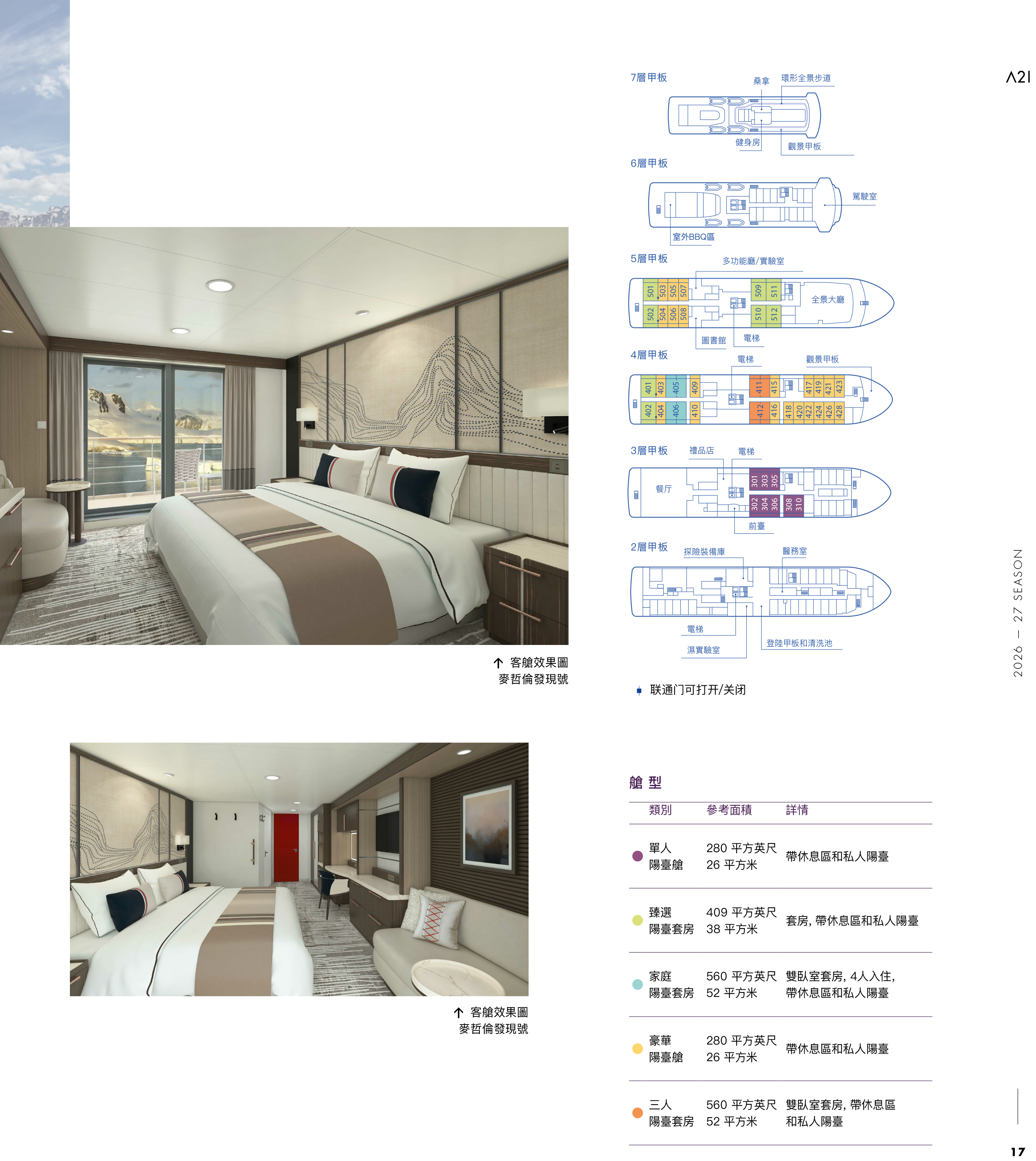 | 麦哲伦探索号 | 三人阳台套房 | 舷窗舱 | 阳台舱 | 高级阳台舱 | 尊享套房 | 顶层套房 | 单人阳台舱 | ||||